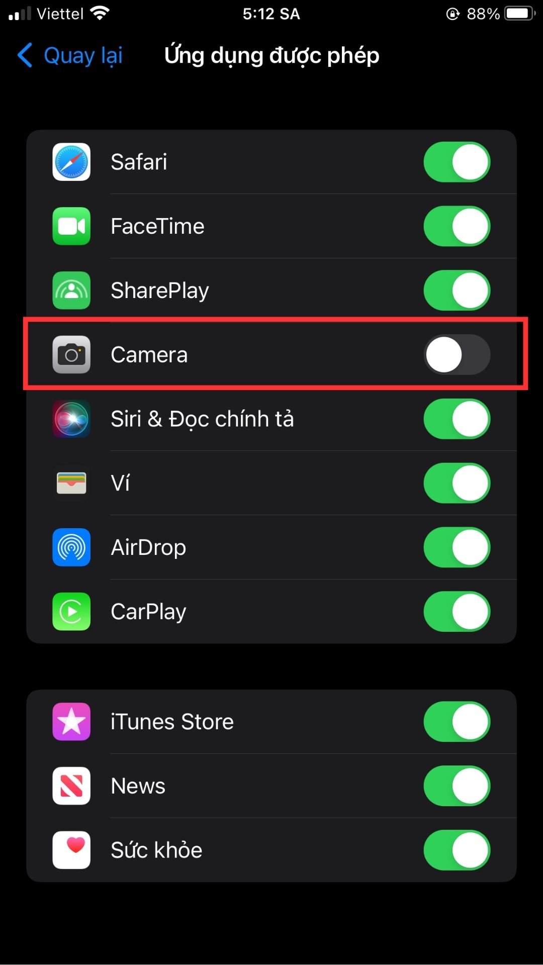 - Bước 4: Trong mục “Ứng dụng được phép”, tắt tính năng camera bằng cách gạt nút sang bên trái.